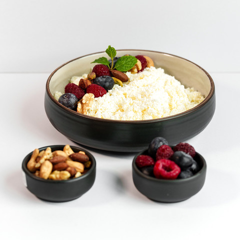 Свежий, нежный творог с густой сметаной, сочными ягодами и орехами. Вес порции: 200 грамм.